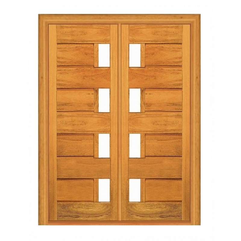 Porta com 02 folhas abrindo em giro. O conjunto é enviado sem dobradiças e fechadura.